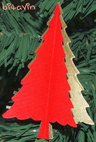 Die Bäume sind mit einer Tannenbaumstanzform ausgestanzt und dann jeweils vier Stück gegeneinander geklebt.